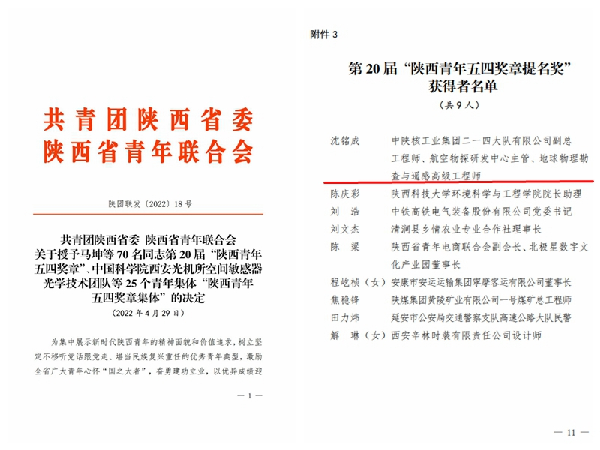 為集中展示新時(shí)代陜西青年的精神面貌和價(jià)值追求,樹立堅(jiān)定不移聽黨話跟黨走、堪當(dāng)民族復(fù)興重任的優(yōu)秀青年典型,近日,共青團(tuán)陜西省委、陜西省青年聯(lián)合會(huì)表彰了一批“陜西青年五四獎(jiǎng)?wù)隆?/span>的個(gè)人和集體,其中公司副總工程師、航空物探研發(fā)中心主管沈銘成同志被團(tuán)省委、省青聯(lián)授予第20屆“陜西青年五四獎(jiǎng)?wù)绿崦?jiǎng)”,這也是中陜核工業(yè)集團(tuán)有限公司唯一獲此殊榮的個(gè)人。