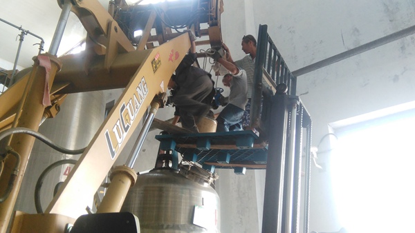 高溫季節,車間內的溫度要比室外高出2℃以上,而且由于工作環境相對封閉,呆在車間里面就像洗桑拿。在悶熱高溫環境下,職工們的汗珠順著臉頰不停地往下掉,每天的衣服都是濕了又干,干了又濕。大家卻依然堅守崗位,順利的將4個重達2噸的攪拌罐,安裝在操作平臺上,確保了天然谷公司的正常生產。